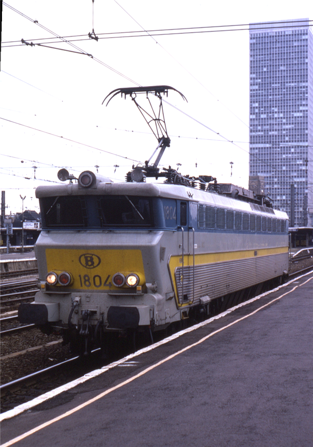 One of the quadruple voltage locos used on international services from Belgium. 1804 is seen at Bruxelles Midi/Brussel Zuid on 27 July 1985.