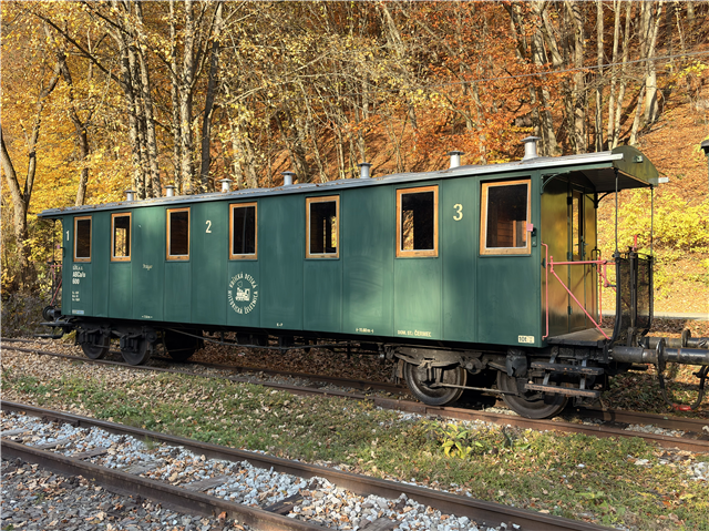 ABCa/u (first-class, second-class, third-class, four-axle, narrow-gauge) 600 was built in 1913 as a second class coach. It burnt down in 1993 and was rebuilt in 1996 with first, second and third class compartments.